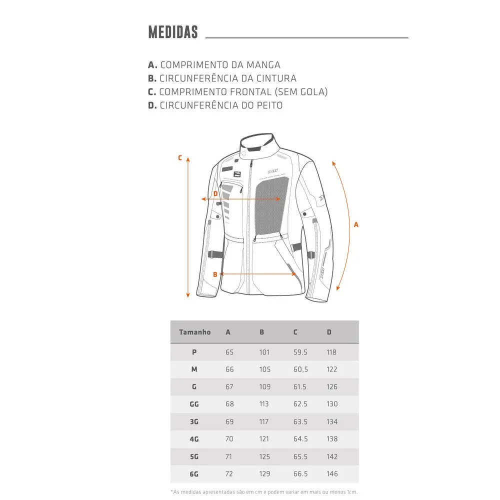 Esse tipo de tabela ajuda muito na hora da escolha. Se suas medidas estiverem entre dois tamanhos, opte pelo maior, especialmente se a jaqueta tiver forro interno. Sempre confira a tabela do produto que escolher.