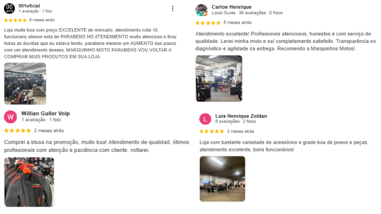 Com mais de 33 anos de história, a Marquinho Motos oferece soluções completas para motociclistas de todos os estilos. Somos revendedores autorizados pelas melhores marcas do mercado como LS2, Norisk, Pro Tork, EBF, FW3, Scam, Givi, Riffel, DID, Vaz, Alpinestars, X11, California Racing, Nave, GP Tech, Cawu, Scud, Tutto, Michelin, Pirelli, Technic, Metzeler, Levorin, Maggion e muitas outras. Aqui, você encontra apenas produtos com qualidade, procedência e garantia.
